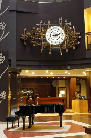 Este conjunto representa una maquina de relojería antigua y sus coronas y piñones se mueven a una velocidad que el cliente puede aumentar o disminuir con un simple potenciometro. Tiene unas medidas de 4×2,50m y esta fabricado con materiales tales como madera, latón, metacrilato, laminas de pan de oro, etc.