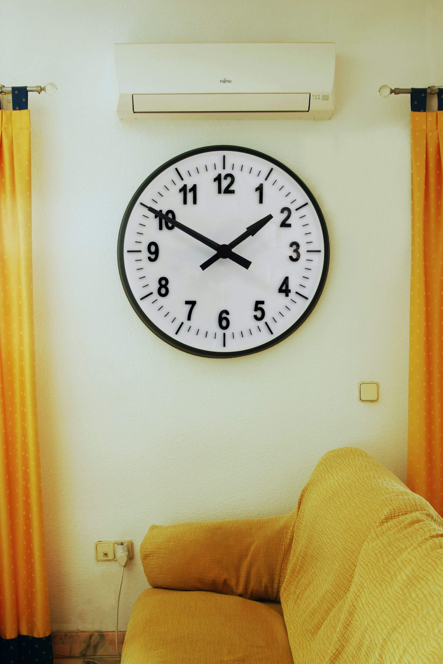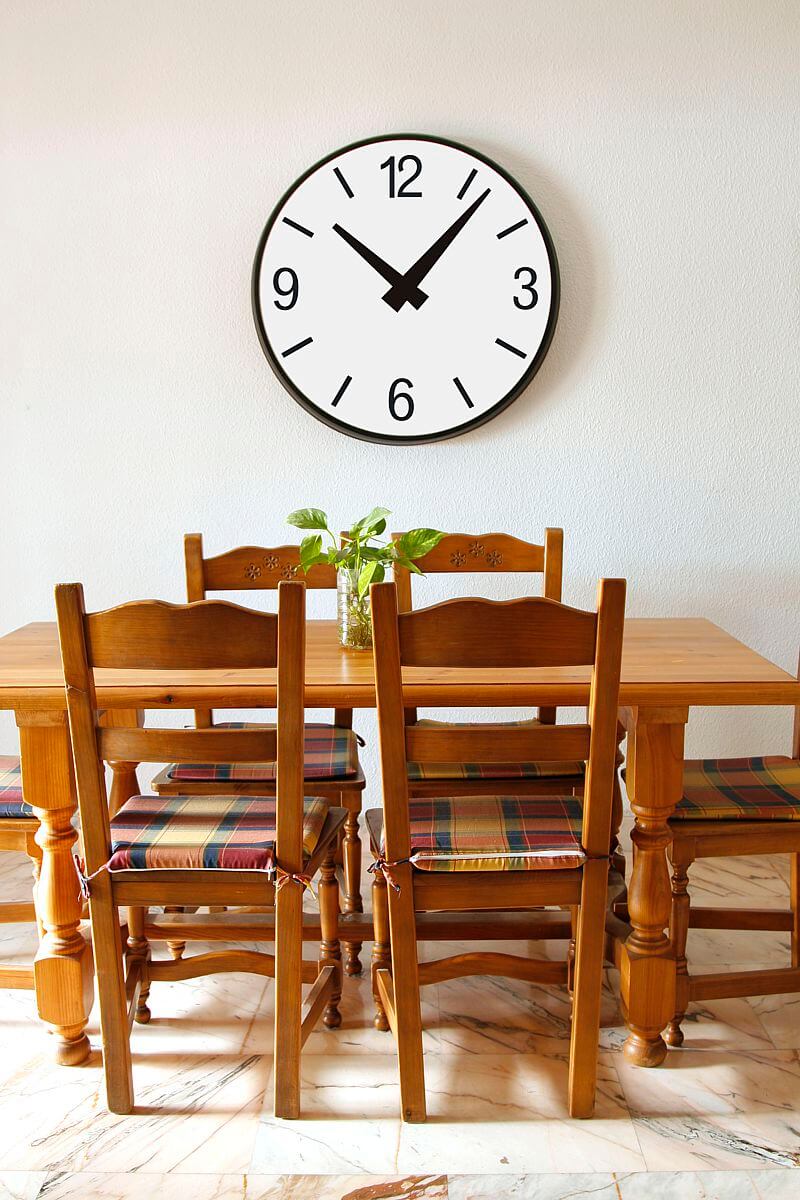 El movimiento de las agujas es de la prestigiosa casa suiza Mobatime, en la imagen se aprecia la diferencia entre el típico movimiento del reloj de cocina y el movimiento Mobatime que permite mover agujas para esferas de hasta 80cm de diámetro. La puesta en hora se realiza con un solo pulsador de forma sencilla y rápida.
